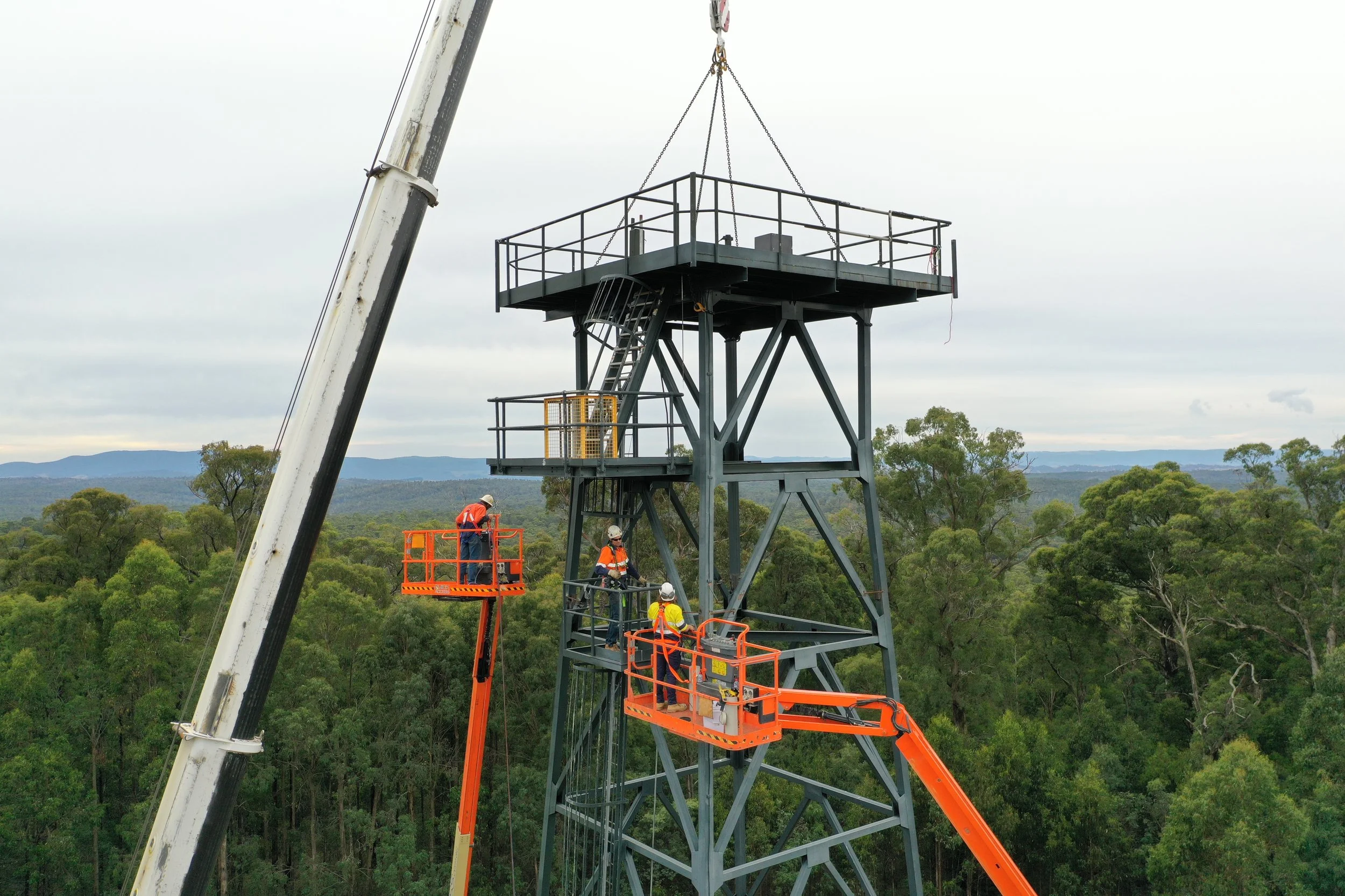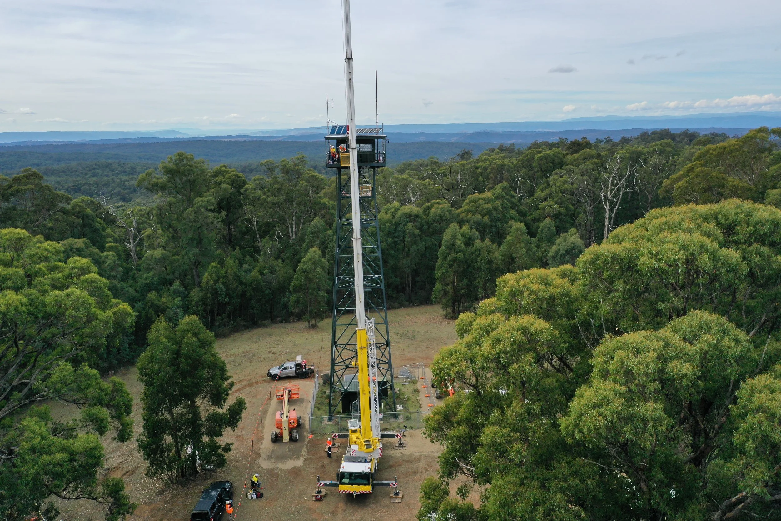 Strath Fire Tower was approximately 29 m high, and a painted steel lattice structure made up of welded hollow box sections and open channel sections, which supports a platform at the top with a 3.5 m x 3.5 m observation cabin in the Kinglake National Park. MWC’s records suggest the tower was constructed between 1942 and 1955.